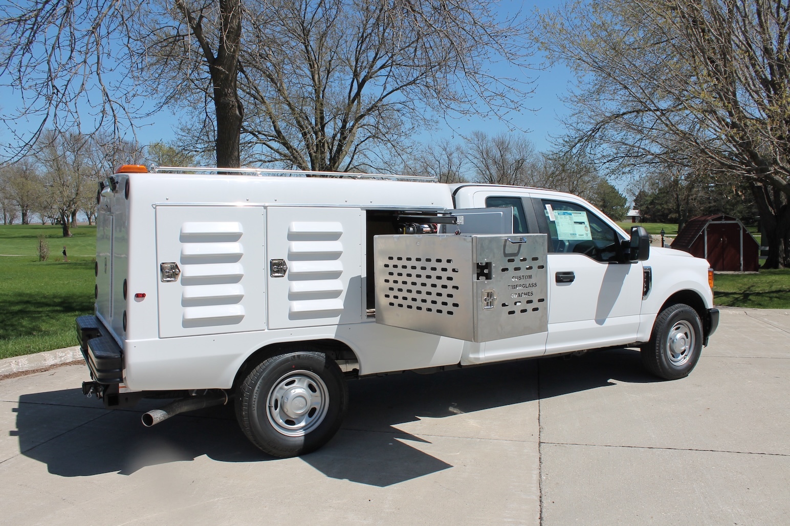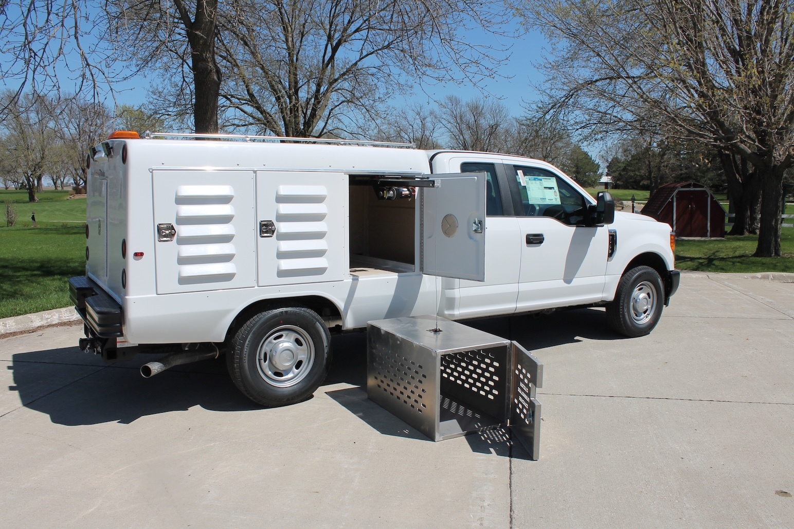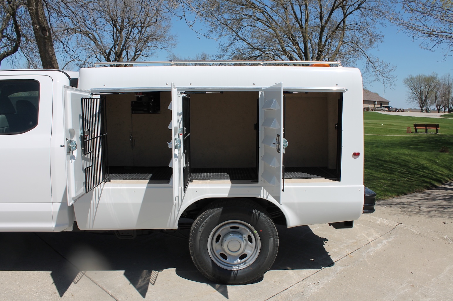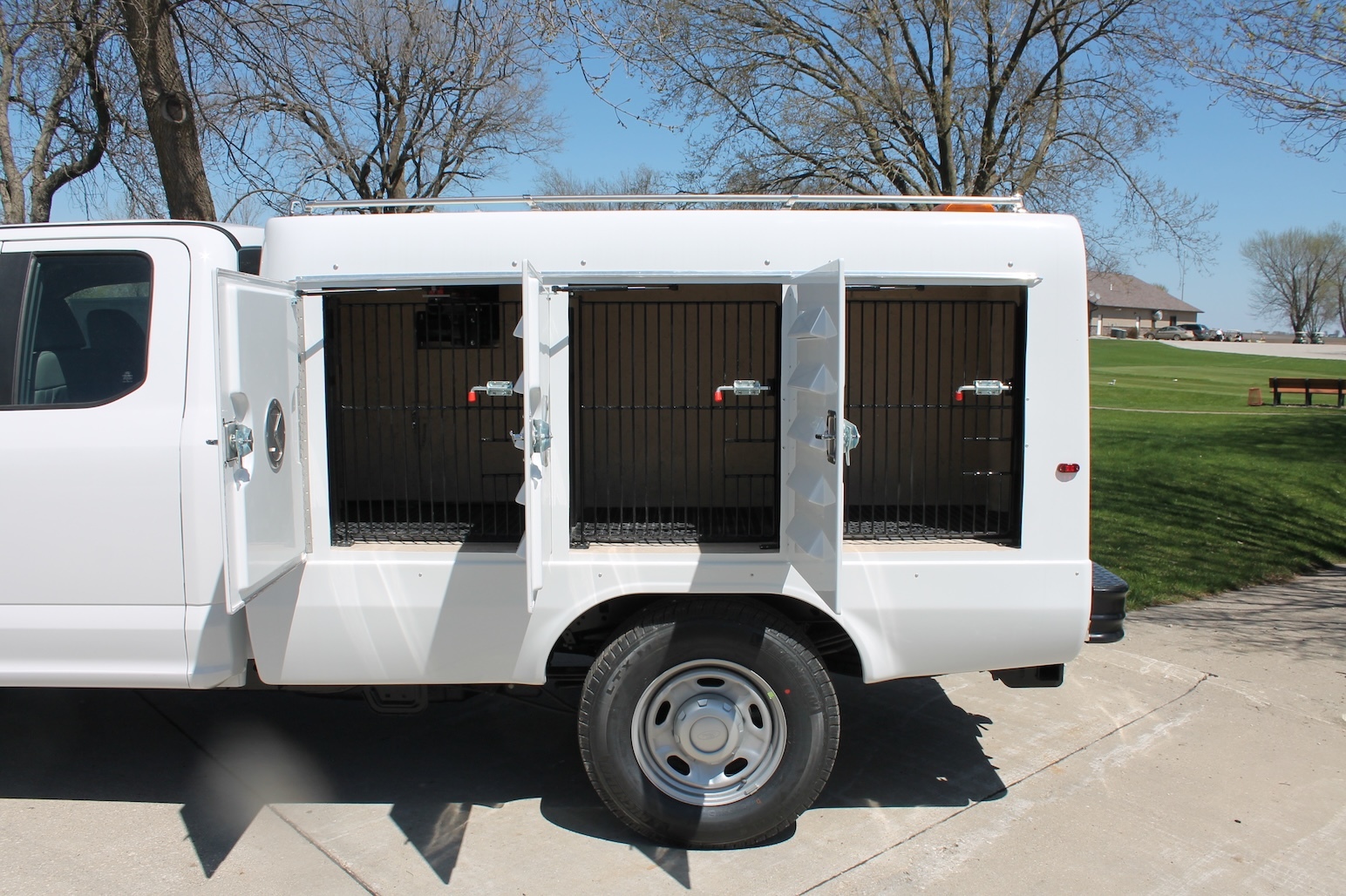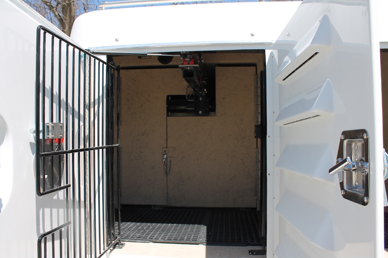 A fiberglass one-piece molded animal transportation unit with (6) six animal compartments and (1) storage compartment with the access door in the back of the unit. Standard features include a fresh air ventilation system vented to each compartment, a pass-through swing door in the front compartment, bright white LED lighting in each compartment, solid partitions creating 6 individual compartments, sloped floor drainage system, back up alarm, high-low brake lights and flashers, gel coated fiberglass doors with five molded louver vents in the exterior door panel and a vent on the interior door to control airflow.