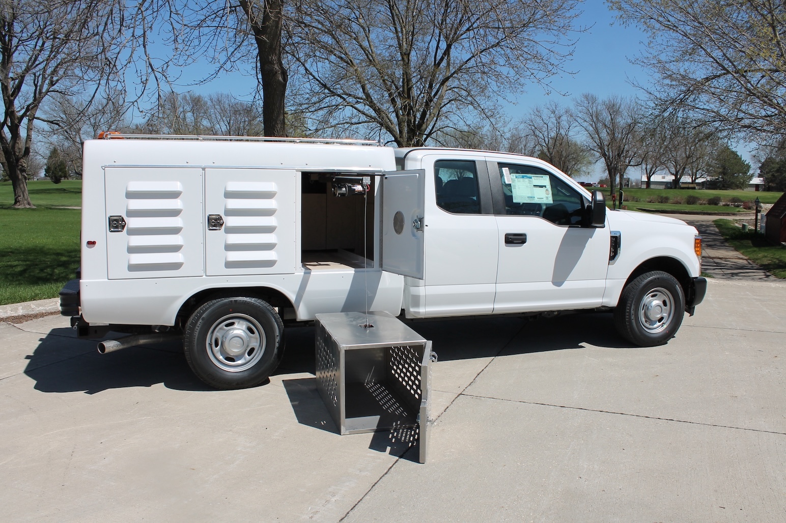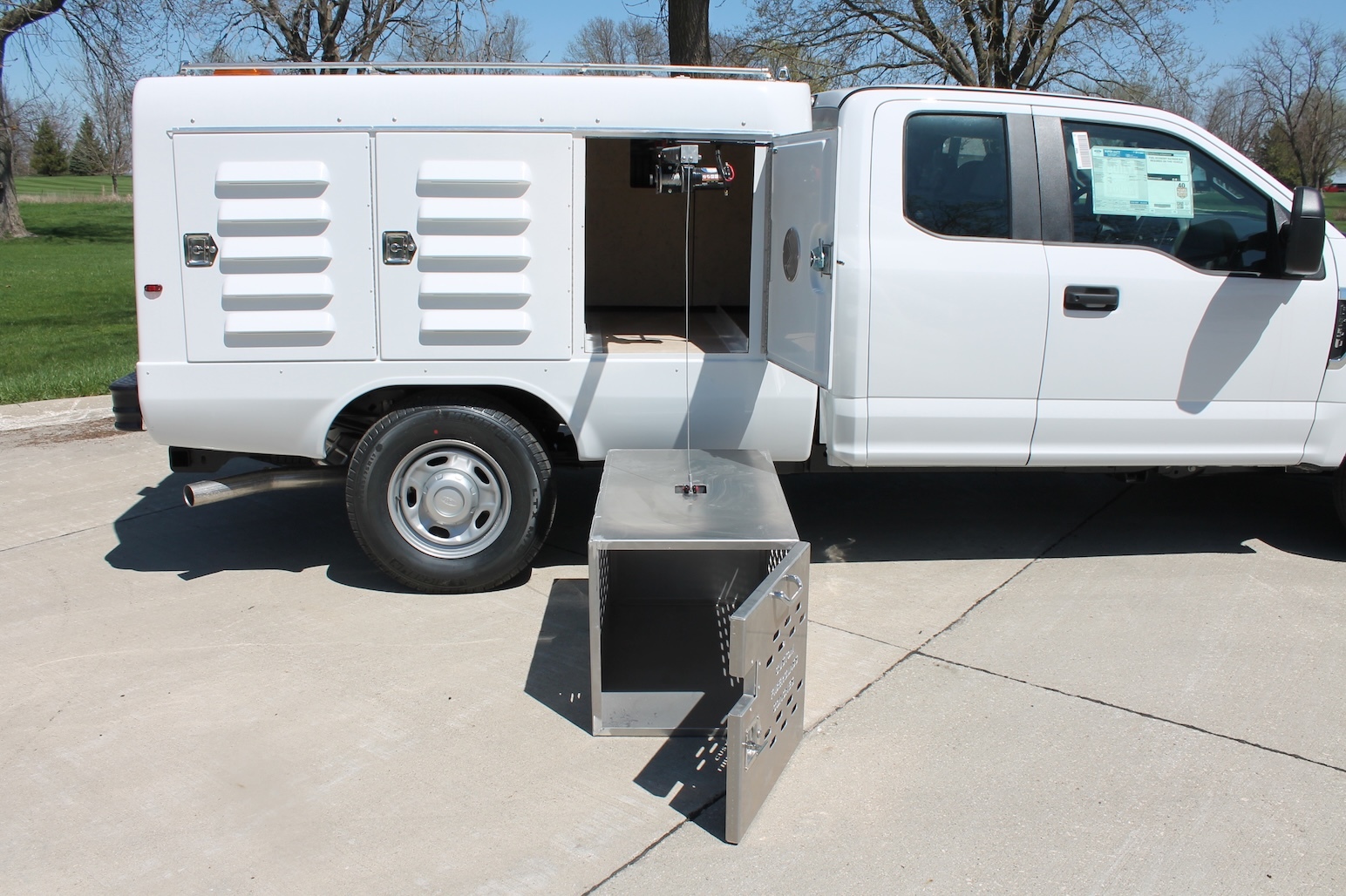 Telescoping monorail system with high capacity precision ground ball type linear bearings, electric hoist and wireless remote control. Hoist cable will have a hook attachment to accommodate use with a large animal cage. Rail system will be mounted across the roof of the front pass-through compartment with hoist exiting out the front passenger side compartment. Large Animal Cage to be made of aluminum with dimensions of 23” wide x 24” high x 42” deep. The hoist system will have a minimum capacity of 200 pounds. Optional carrier tray available.