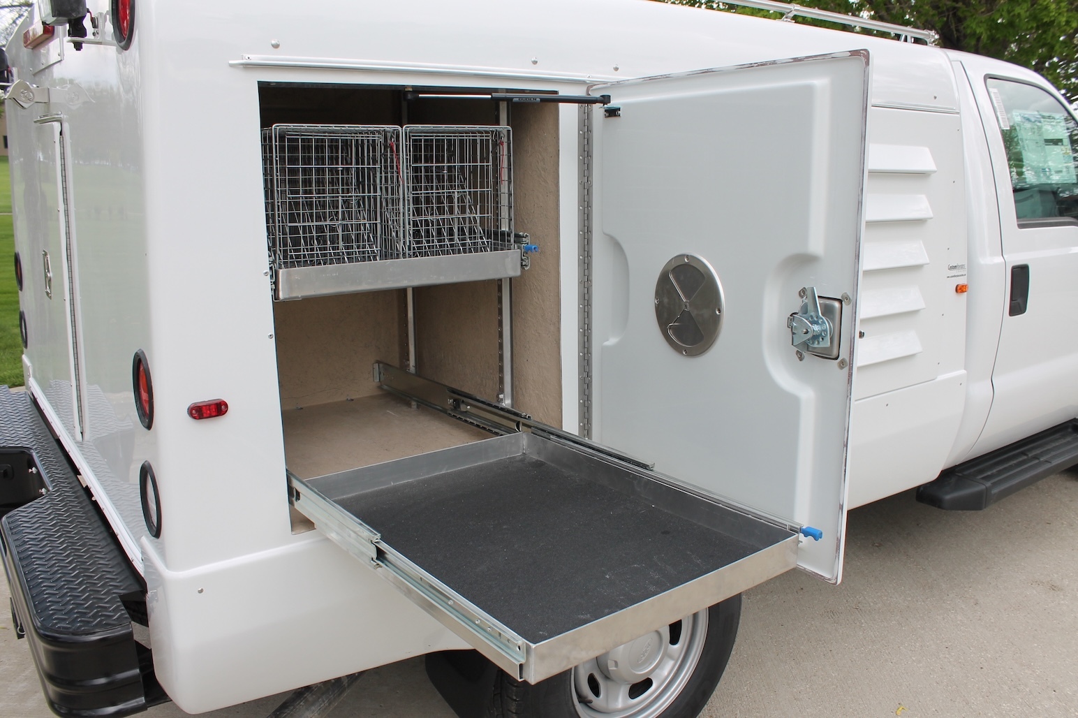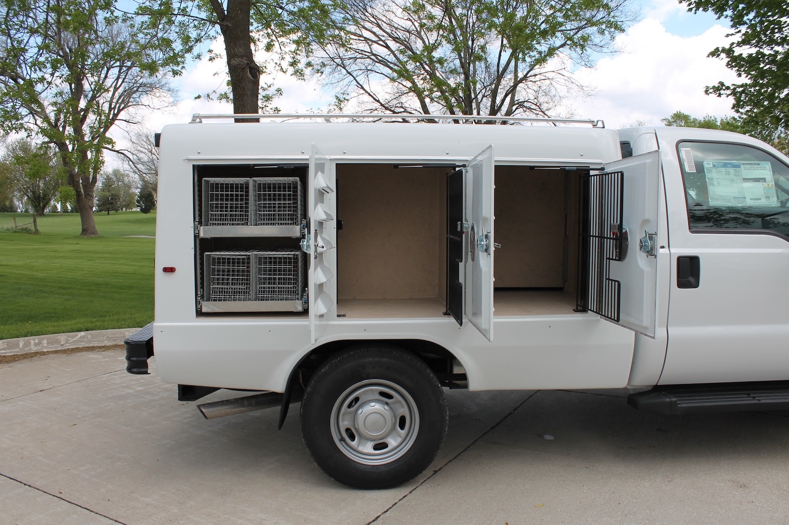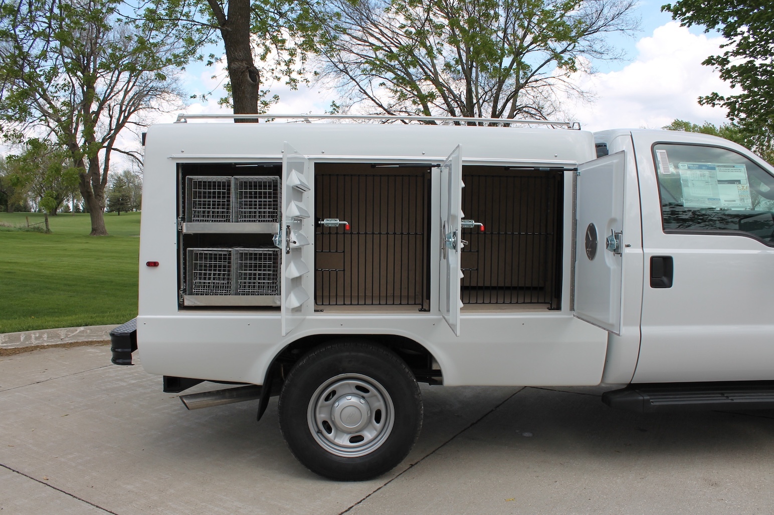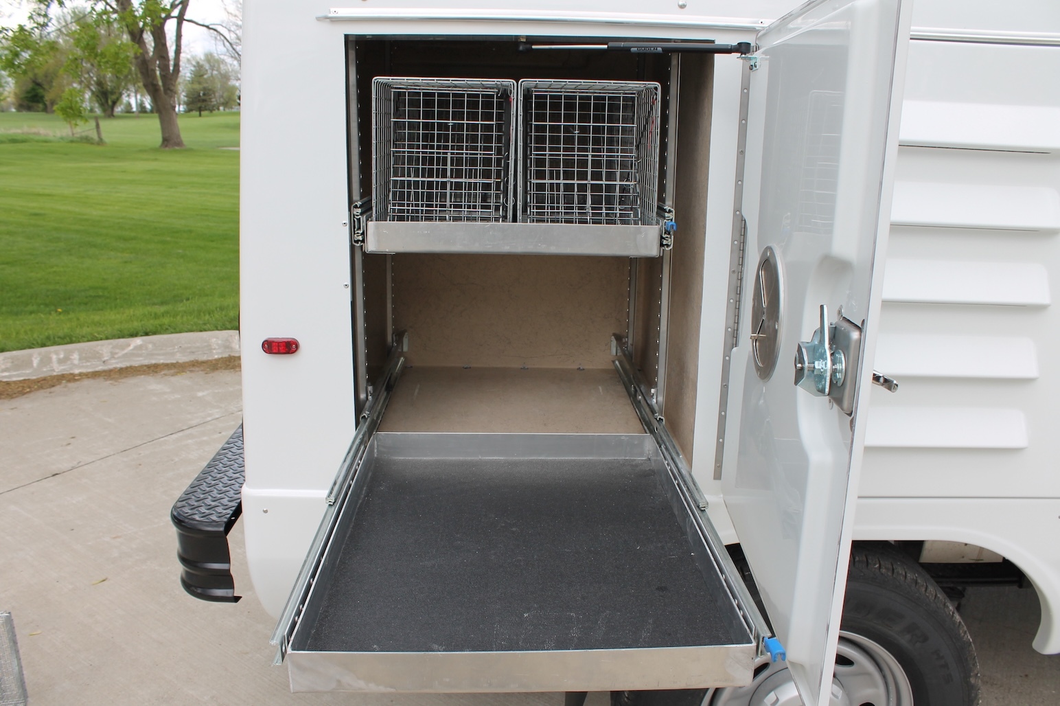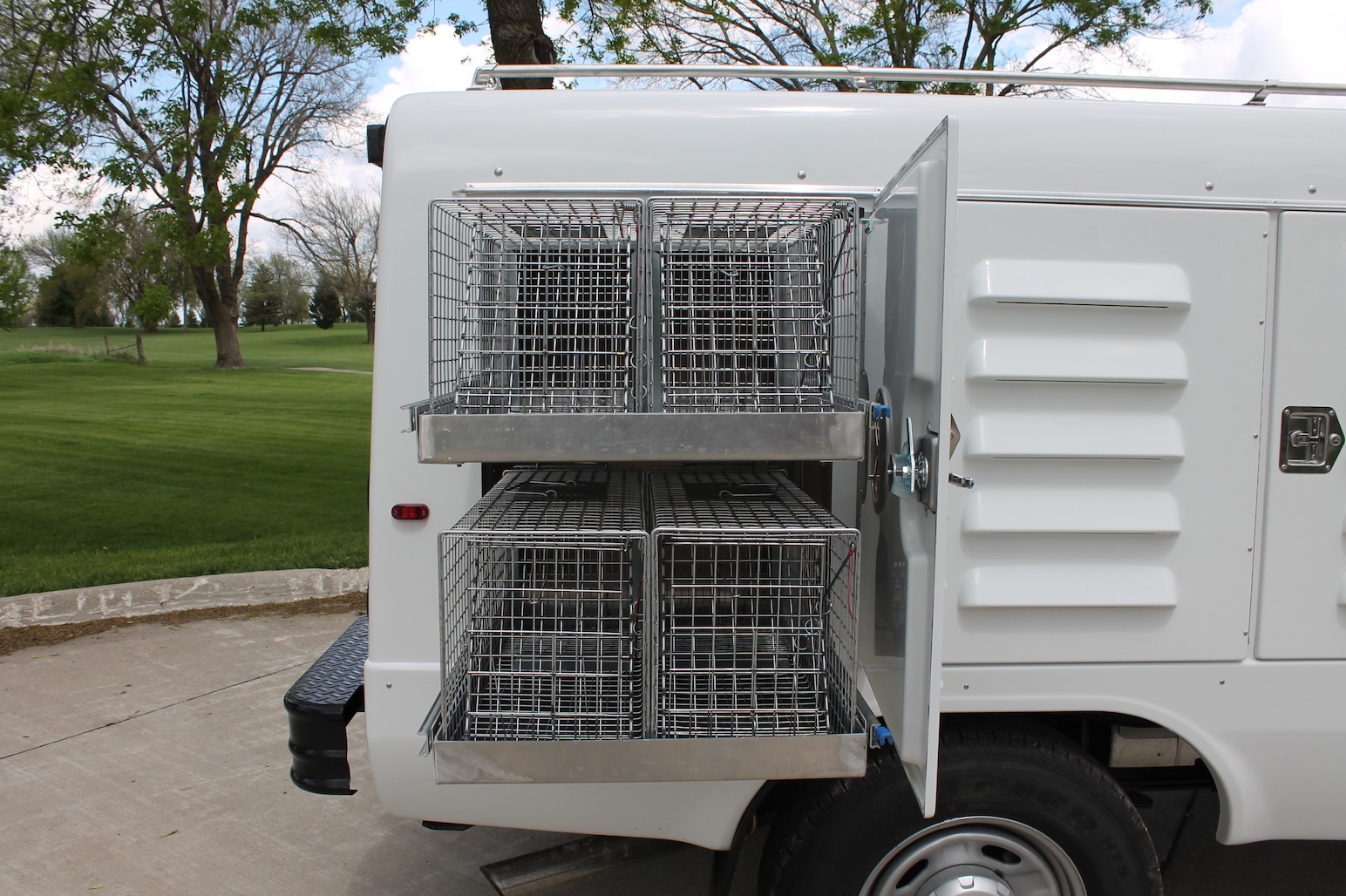 A fiberglass one-piece molded animal transportation unit with (6) six animal compartments. Standard features include a fresh air ventilation system vented to each compartment, a pass-through swing door in the front compartment, bright white LED lighting in each compartment, solid partitions creating 6 individual compartments, sloped floor drainage system, back up alarm, high-low brake lights and flashers, and Ultimate Safety doors with large adjustable louvers.