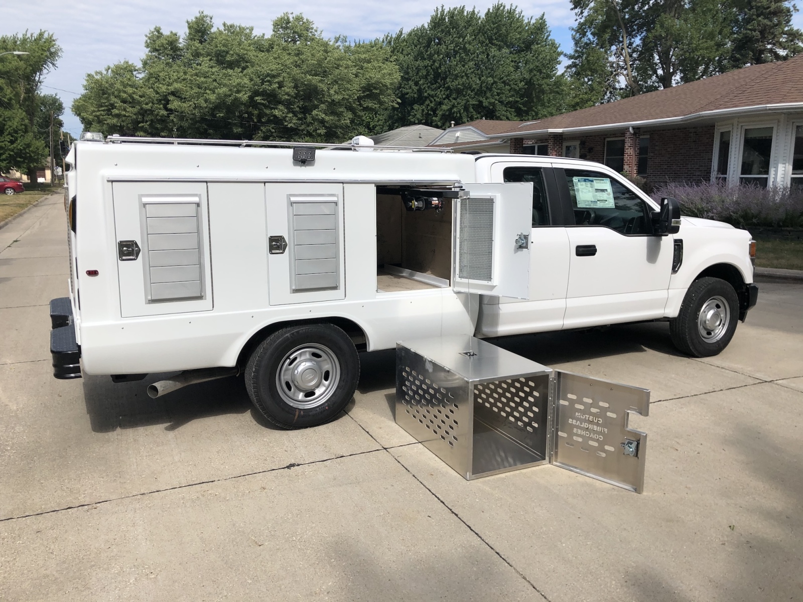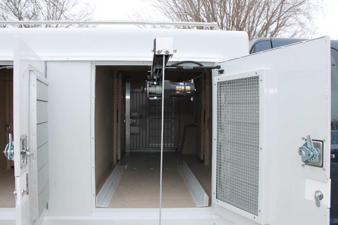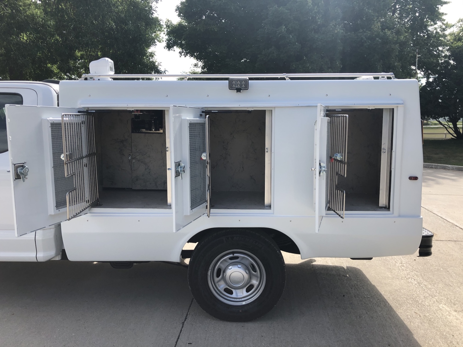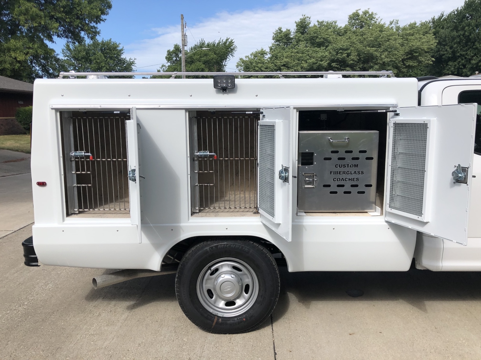 A fiberglass one-piece molded animal transportation unit with (6) six animal compartments and (1) storage compartment with the access door in the back of the unit. Standard features include a fresh air ventilation system vented to each compartment, a pass-through swing door in the front compartment, bright white LED lighting in each compartment, solid partitions creating 6 individual compartments, sloped floor drainage system, back up alarm, high-low brake lights and flashers, and Ultimate Safety doors with large adjustable louvers.