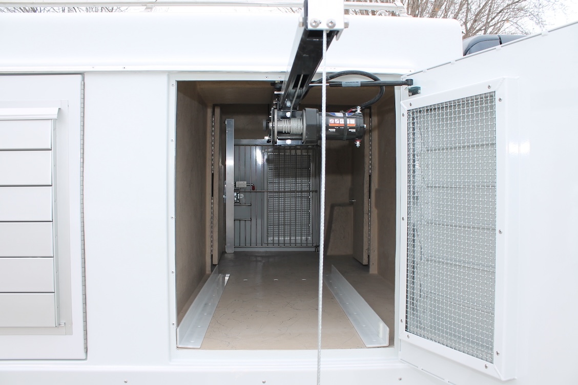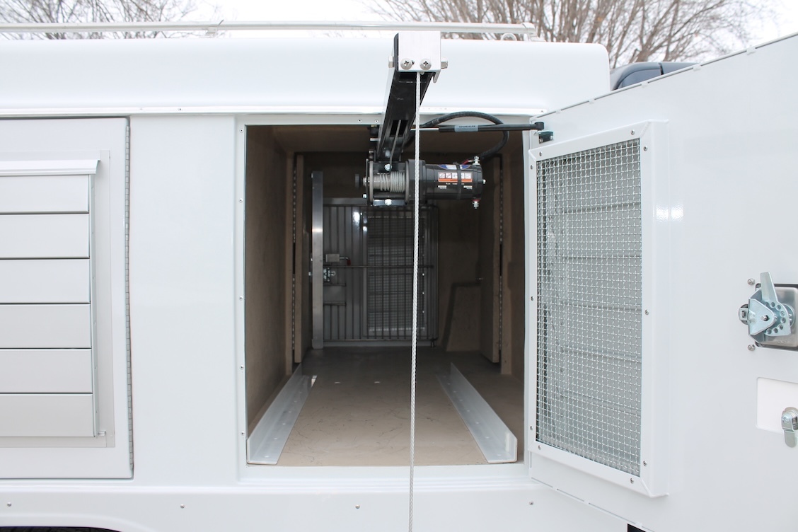 | Back Saver Hoist: | Telescoping monorail system with high capacity precision ground ball type linear bearings, electric hoist and wireless remote control. Hoist cable will have a hook attachment to accommodate use with a large animal cage. Rail system will be mounted across the roof of the front pass-through compartment with hoist exiting out the front passenger side compartment. Large Animal Cage to be made of aluminum with dimensions of 23” wide x 24” high x 42” deep. The hoist system will have a minimum capacity of 200 pounds. |