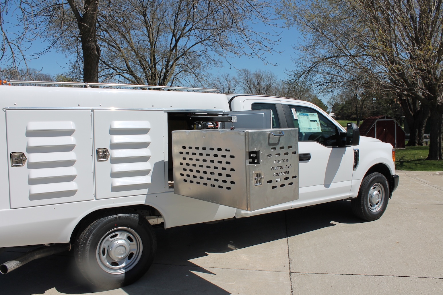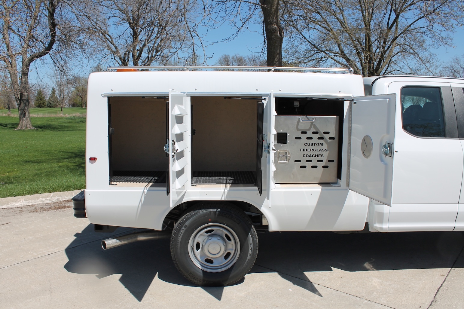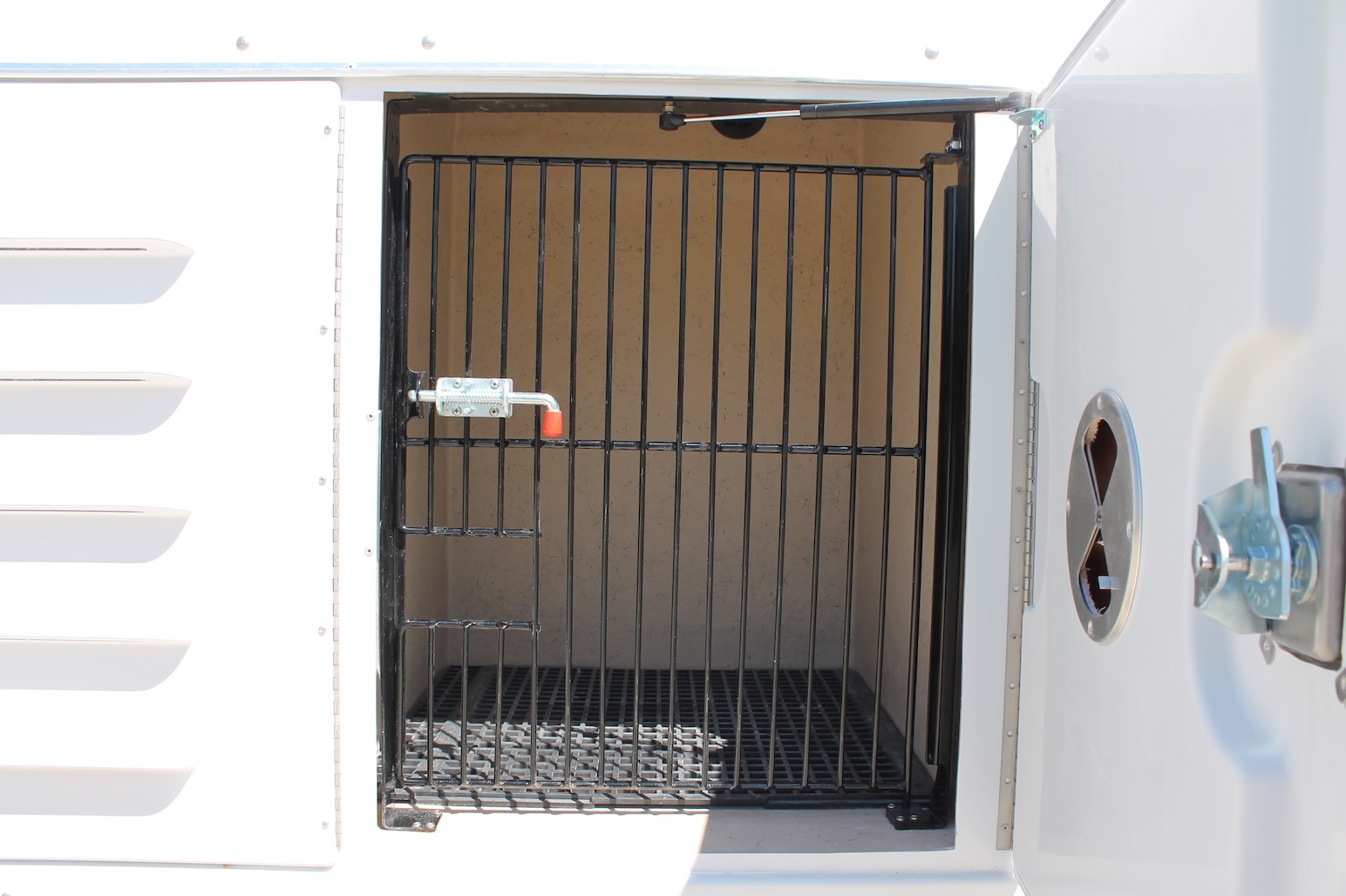 A fiberglass one-piece molded animal transportation unit with (6) six animal compartments and (1) storage compartment with the access door in the back of the unit. Standard features include a fresh air ventilation system vented to each compartment, a pass-through swing door in the front compartment, bright white LED lighting in each compartment, solid partitions creating 6 individual compartments, sloped floor drainage system, back up alarm, high-low brake lights and flashers, gel coated fiberglass doors with five molded louver vents in the exterior door panel and a vent on the interior door to control airflow.