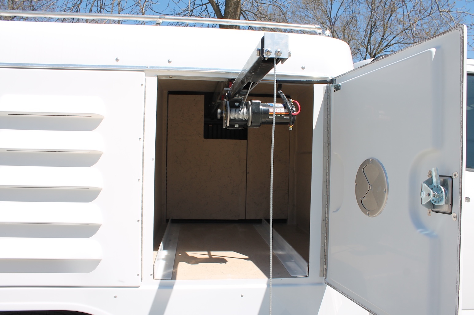 Telescoping monorail system with high capacity precision ground ball type linear bearings, electric hoist and wireless remote control. Hoist cable will have a hook attachment to accommodate use with a large animal cage. Rail system will be mounted across the roof of the front pass-through compartment with hoist exiting out the front passenger side compartment. Large Animal Cage to be made of aluminum with dimensions of 23” wide x 24” high x 42” deep. The hoist system will have a minimum capacity of 200 pounds. Optional carrier tray available.