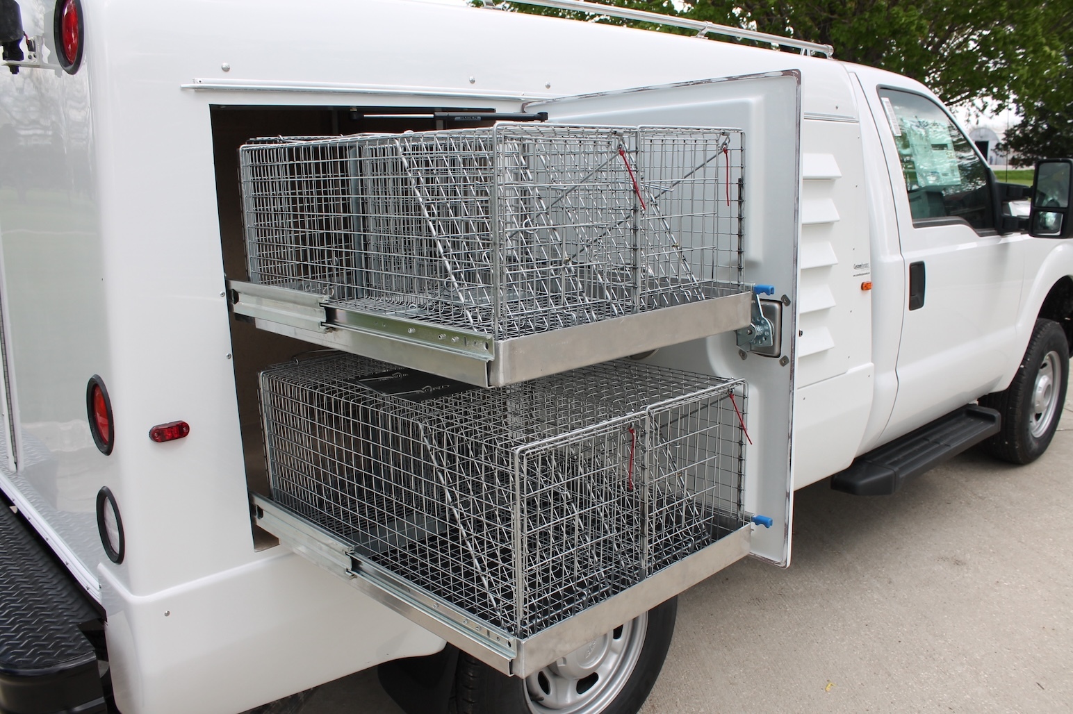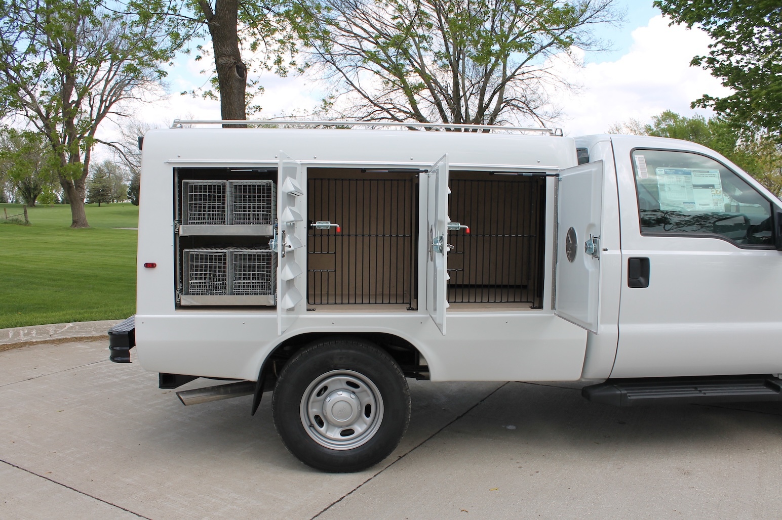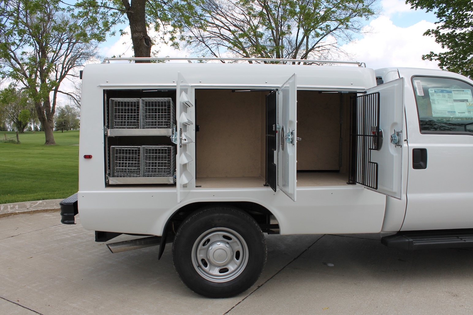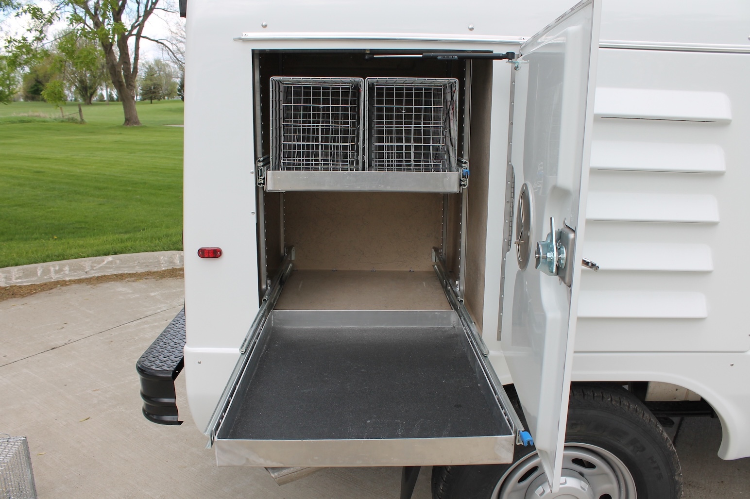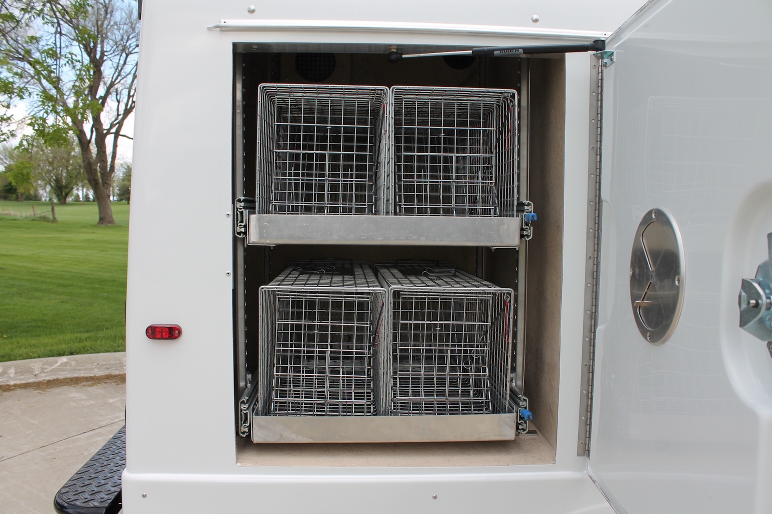 A fiberglass one-piece molded animal transportation unit with (6) six animal compartments. Standard features include a fresh air ventilation system vented to each compartment, a pass-through swing door in the front compartment, bright white LED lighting in each compartment, solid partitions creating 6 individual compartments, sloped floor drainage system, back up alarm, high-low brake lights and flashers, and Ultimate Safety doors with large adjustable louvers.